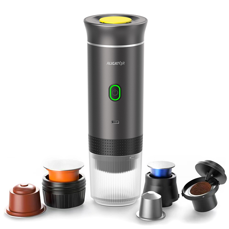 | Obsah balení | Kávovar ALIGATOR PortaCaffé, 3× adaptér (Nespresso, Dolce Gusto, mletá káva), odměrka, návod, USB-A / USB-C kabel |