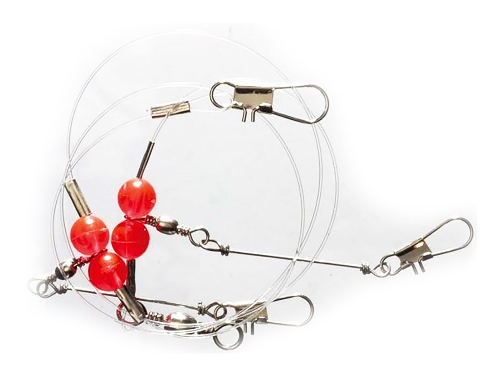Systém pro velké tresky obecné a tresky tmavé, se třemi ocelovými háčky, červenými bužírkami a stříbrnými střapci. Zajistí