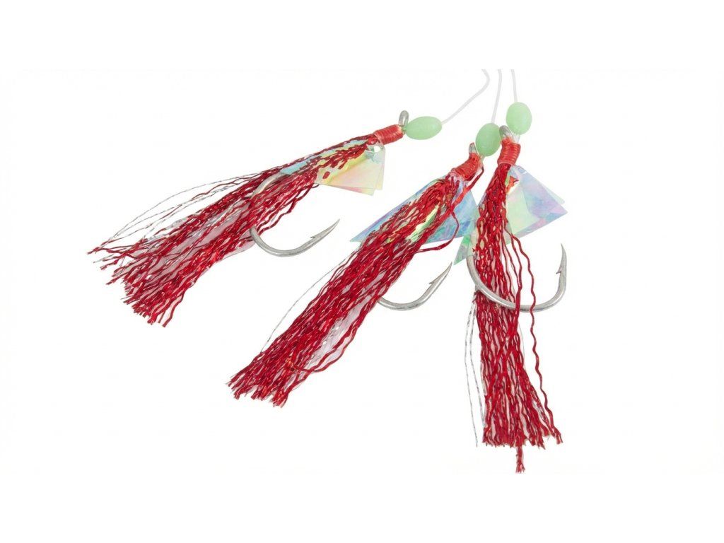 Systém pro velké tresky obecné a tresky tmavé, se třemi ocelovými háčky, červenými bužírkami a stříbrnými střapci. Zajistí