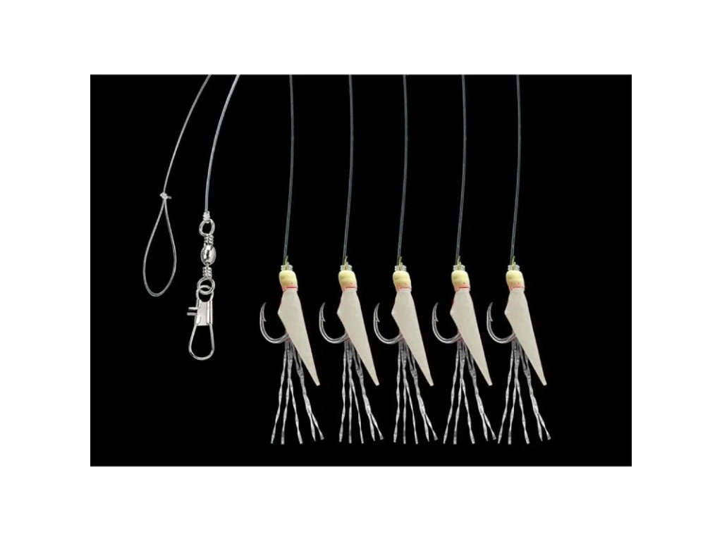 Kvalitní mořský návazec s pěti háčky velikost 4 potaženými pravou rybí kůží v přírodní barvě natural.
