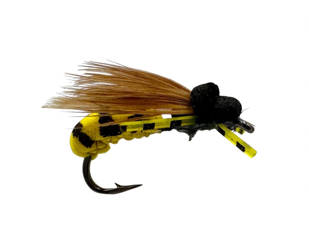 Kontrastní černo-žluté zbarvení vytváří silnou siluetu, která ryby spolehlivě provokuje i ve zhoršených světelných podmínkách. Pěnové tělo zajišťuje vynikající plovatelnost a stabilitu na hladině, zatímco realistické nožičky a křidélko napodobují přirozený pohyb hmyzu. Muška je ideální pro cílený lov větších ryb podél břehů, u převislých stromů a v klidnějších úsecích.