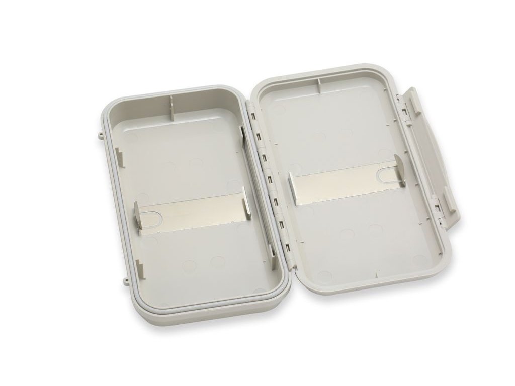Krabička je vybavena vodotěsným silikonovým těsněním, které chrání obsah před vlhkostí, deštěm i postříkáním. Odolné plastové tělo s vlnitým povrchem, zaoblenými rohy a pevnou konstrukcí poskytuje bezpečné držení a vysokou životnost. Velká boční přezka umožňuje snadné a spolehlivé otevírání a zavírání i s mokrýma rukama nebo v rukavicích.