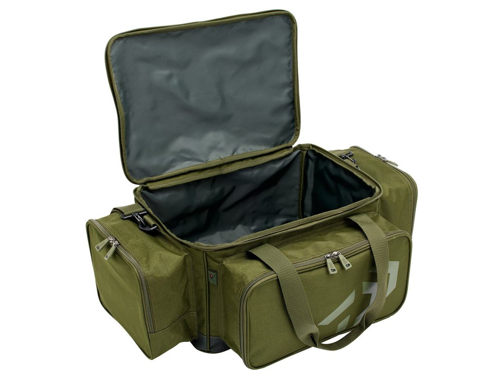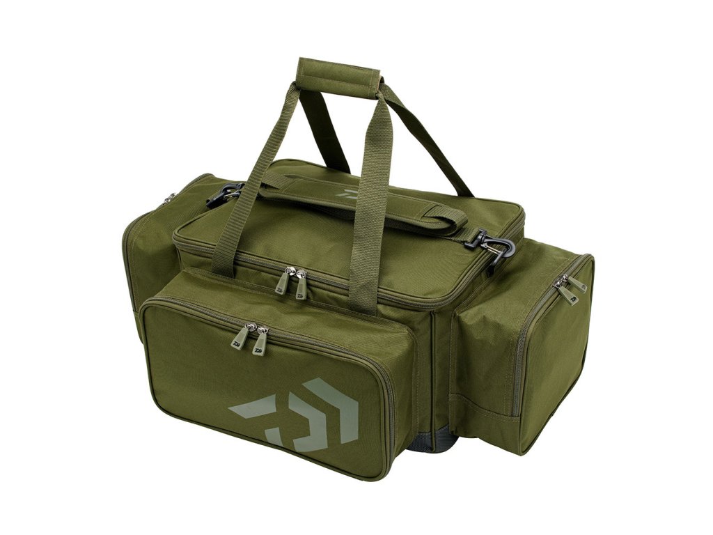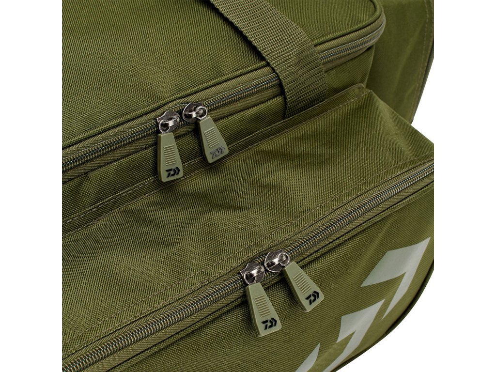 Prostorná rybářská taška, která obsahuje několik samostatných polstrovaných přepážek, které se dají díky suchému zipu libovolně upravovat podle velikosti přepravovaného materiálu.