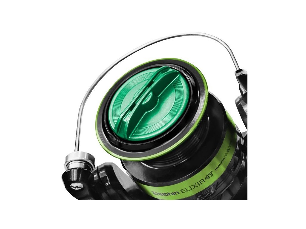 Designově nevšední naviják s přední brzdou za příjemnou cenu. To je Delphin ELIXIR, který svým zeleno-černým provedením vyčnívá z řady kompaktních navijáků, vhodných na přívlač, feeder či lov se splávkem.
