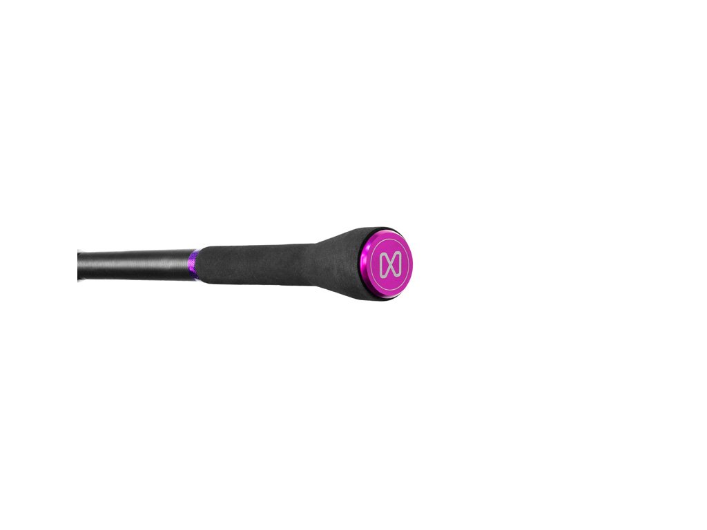 Nad touto "hypnotickou" rukojetí najdeme decentní korkové detaily a v celé spodní třetině prutu najdeme i fialové zdobení vyvázané nití. Matný šedý blank a černé vázání oček činí z tohoto prutu elegantního společníka u vody, zatímco moderně laděná spodní část okamžitě upoutá pozornost.