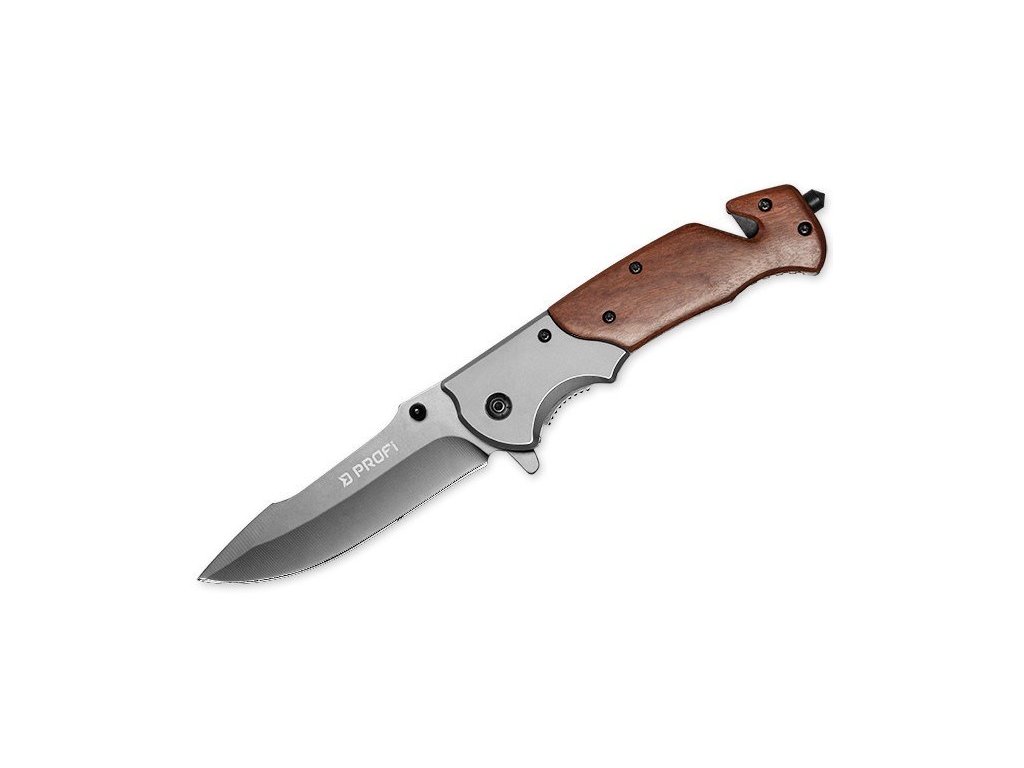 Rukojeť je tvořena kombinací skutečného kvalitního dřeva a kovu. Nůž je vybaven klipem, díky čemuž si jej jednoduše umíte uchytit na opasek nebo zajistit v kapse proti vypadnutí. Čepel má celkovou délku 100mm a je zajištěna pojistkou proti sklopení během používání. Čepel má tvar spear-point (kopí) s vrchním falešným ostřím. Nůž PROFI je navíc vybaven řezačem šňůr, provázků a ostrým hrotem pro rozbíjení skla.