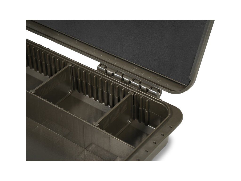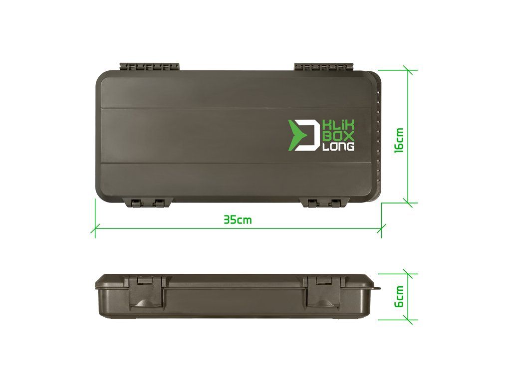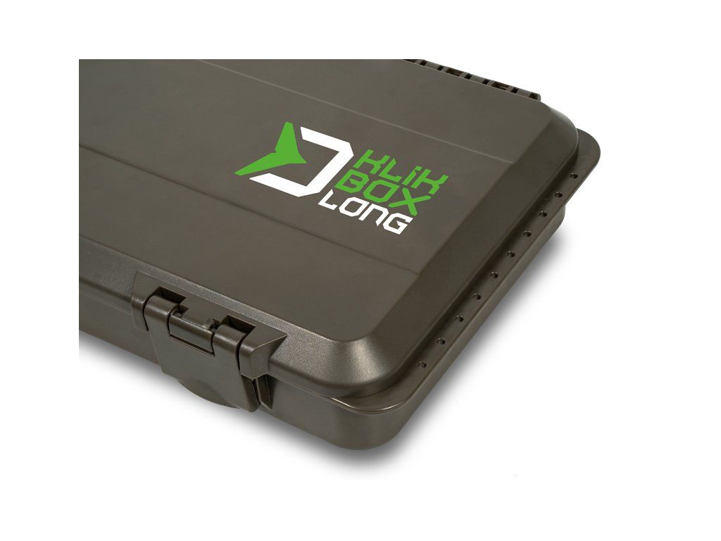 KlikBox Long je navíc vybaven platem z tvrzené pěny a špendlíky pro pohodlné uchycení koncových montáží. Podél celého odkládacího prostoru na návazce naleznete měřítko, podle kterého si budete umět přesně určit délku vašich koncových montáží. Organizér je vyroben z velmi odolného plastu a k jeho komfortnímu otevírání a uzavírání poslouží dva pevné plastové klipy.