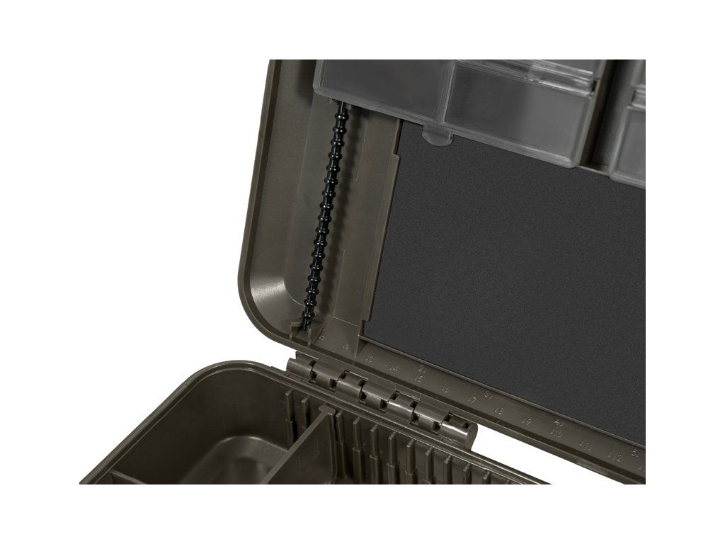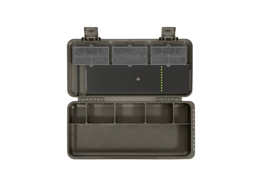 Spodní část organizéru je rozdělena na dvě sekce. První poskytuje největší úložný prostor, ideální pro uložení například utahovače uzlů, jehel, nůžek či jiného příslušenství. Bez problémů se do ní vejde i organizér na návazce KlikBOX Rig, který není součástí balení, ale je možné si jej samostatně dokoupit. Druhá sekce je navíc rozdělena polohovatelnými přepážkami, díky kterým si můžete prostor přizpůsobit přesně podle vašich potřeb.