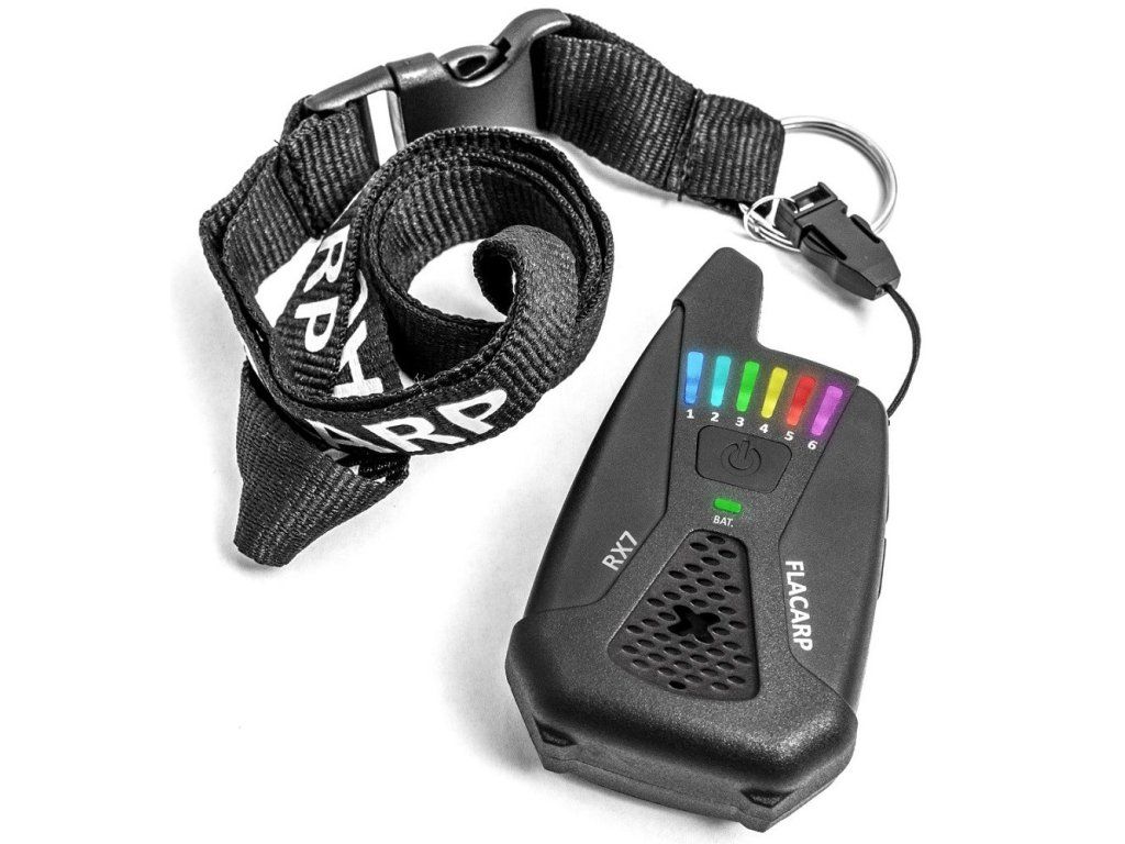 Přijímač (příposlech) FLACARP RX7, vyhodnocující záběr ze signalizátorů záběru FLACARP, alarmů a čidel FLACARP. Zvuková a optická signalizace, až 12 kanálů, napájení běžnými mikrotužkami AAA, dlouhá výdrž baterií, velký dosah.