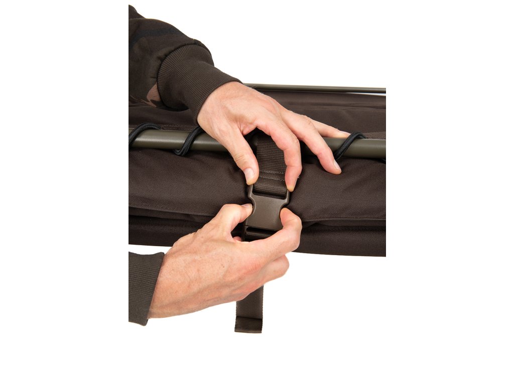 Praktický systém popruhů a přezek umožňuje lehátko kompaktně složit, a to i se spacím pytlem připevněným k lehátku.