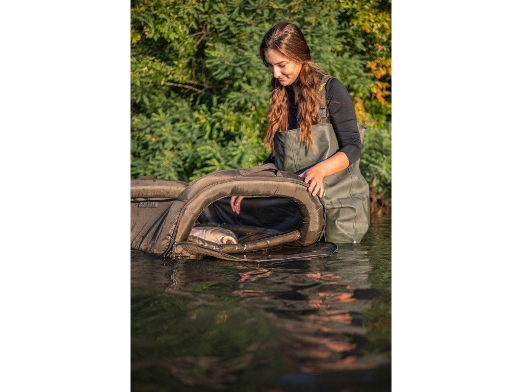 Jednoduchá konstrukce duše, která se rychle nafoukne a vyfoukne pomocí speciálního ventilu. Kolébkový tvar zajistí bezpečnost vašeho úlovku, aby z podložky nevyskočil. Síťované dno zajišťuje dostatek kyslíku pro ryby a lze pro použití podložky na břehu vložit dodávanou měkčenou obdélníkovou matraci. Díky svému promyšlenému designu a tvaru, můžete z každé strany otevřít otvory, které jsou na zip a rychle a bezpečně vypustit rybu zpět do vody. Vyrobeno z nylonu 210D, který má povrchovou úpravu z měkčeného PVC. Je dodáváno včetně nožní pumpy k nafouknutí podložky a přepravní taškou.