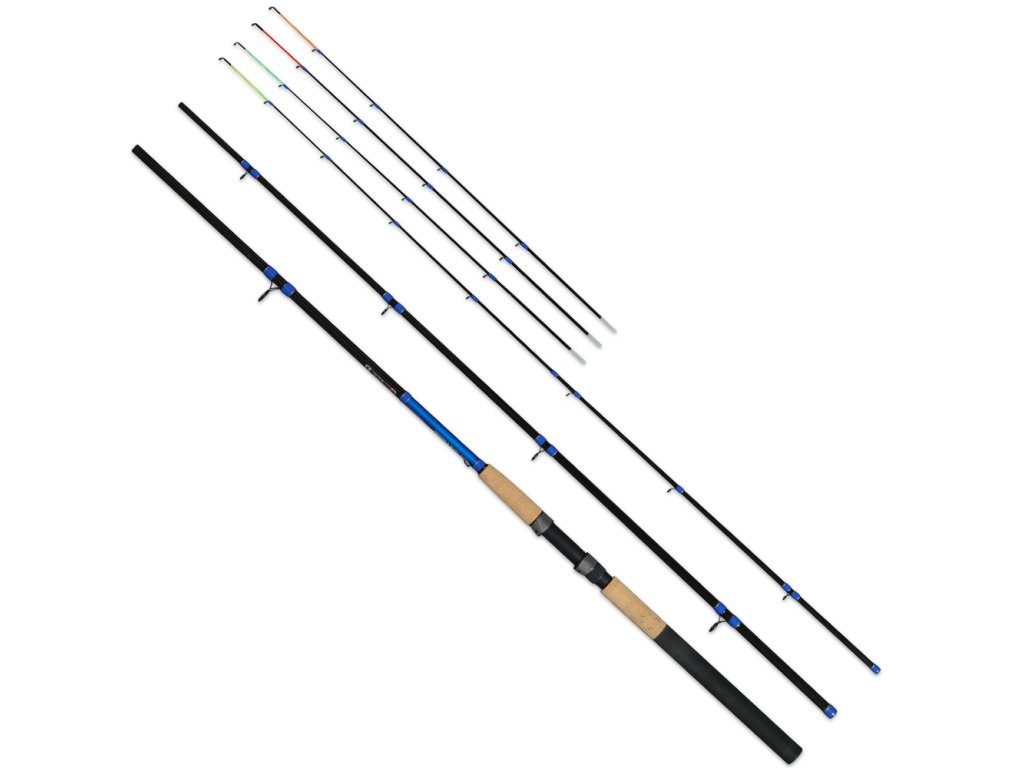 Akční set obsahuje kvalitní feederový prut, který je dodáván se čtyřmi špičkami, navijákem s přední brzdou, 5+1 ložisky a kovovou cívkou.