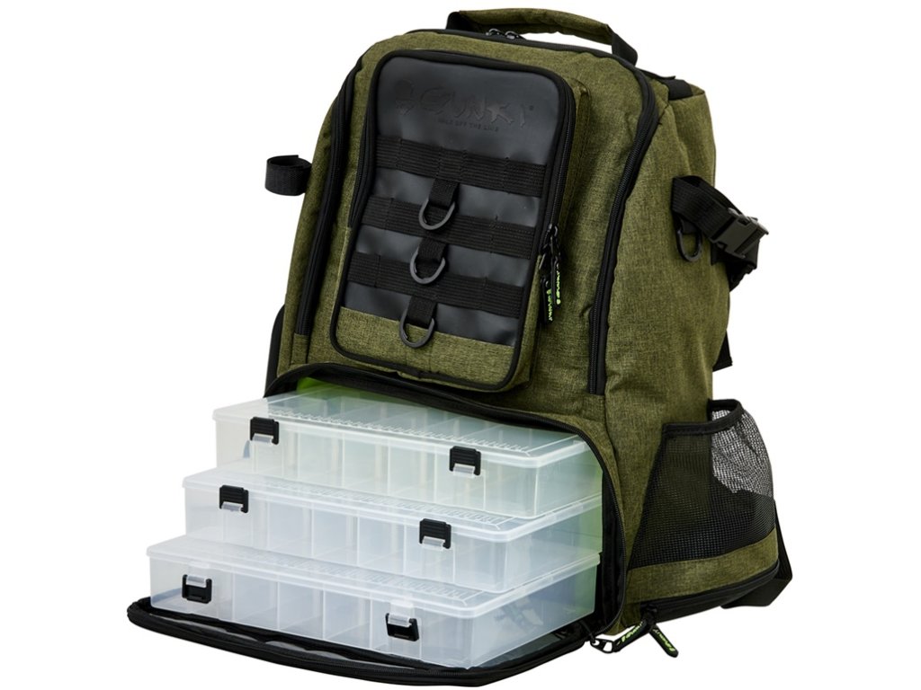 Batoh je vybaven dvěma hlavními komorami na zip. Spodní větší komora navíc obsahuje 3 krabičky na nástrahy. Na vnější straně najdeme dva držáky prutů, kapsu na pití, menší kapsu na drobnosti se zipem a několik kroužků pro uchycení dalšího příslušenství. Díky ergonomickému tvaru perfektně sedí na zádech a pohodlí zajišťují polstrované výztuhy a široké ramenní popruhy, které jsou navíc zajištěny nastavitelným hrudním popruhem. Batoh je navržen pro delší túry a poskytuje spolehlivou oporu a komfort. S Pevná odolná tkanina je doplněná o kvalitní zipy. To vše v Gunki designu.