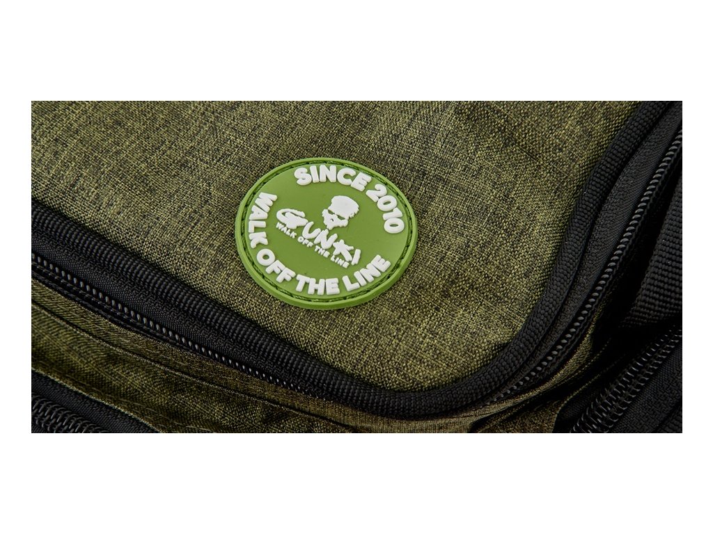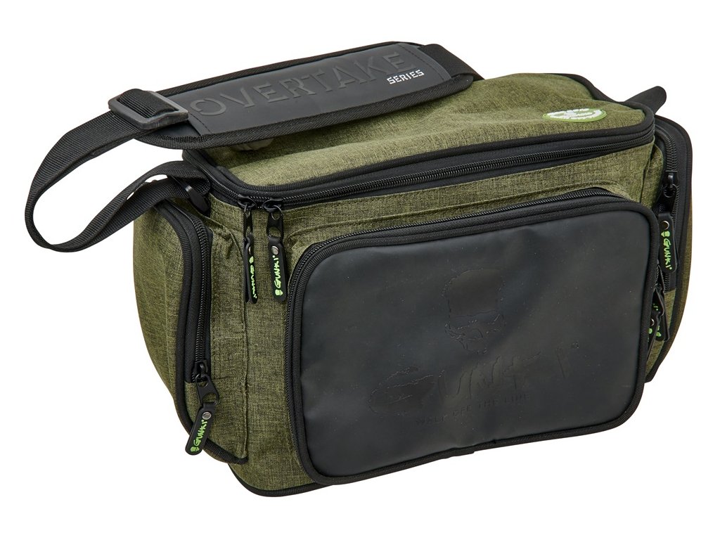 Obsahuje velkou hlavní komoru na zip, tři menší vnější kapsy na zip a nastavitelný polstrovaný popruh přes rameno. Pevná odolná tkanina je doplněná o kvalitní zipy. To vše v Gunki designu. Součástí jsou i dvě krabičky na nástrahy o rozměrech 27,5x19,5x4,5 cm.