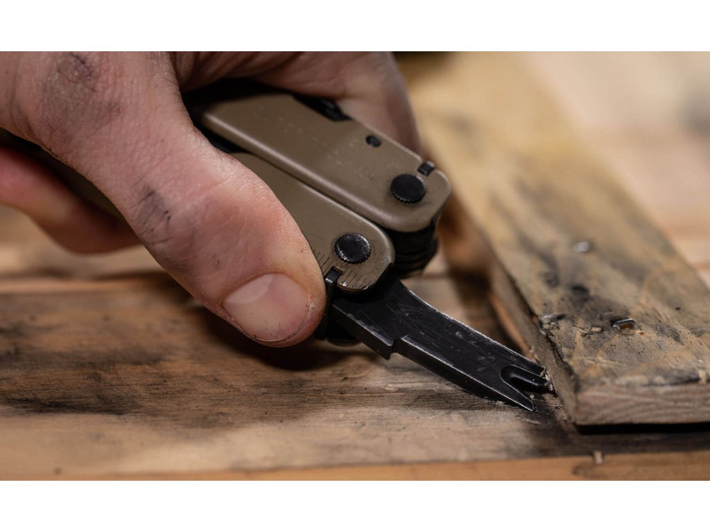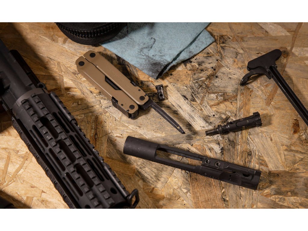 Těmi jsou škrabka karbonu a adaptér na kartáč pro čištění zbraní. Kromě nich se ale ve 280 gramech poctivé nerezové oceli skrývá nadupaná výbava: multifunkční kleště včetně štípaček ocelových lanek a tvrdých drátů s vyměnitelnými břity, dva nože z kvalitní oceli 420HC, pilka, šídlo, pilník na dřevo i na kov, sada otvíráků a čtveřice šroubováků. Všechny nástroje jsou vybaveny pojistkami proti náhodnému zavření, celou tuto mobilní dílnu si pak můžete připnout k batohu pomocí kroužku na karabinu, či jej nosit v koženém či nylonovém pouzdru na opasku. K dostání je v černé nebo pískové-tan barvě.