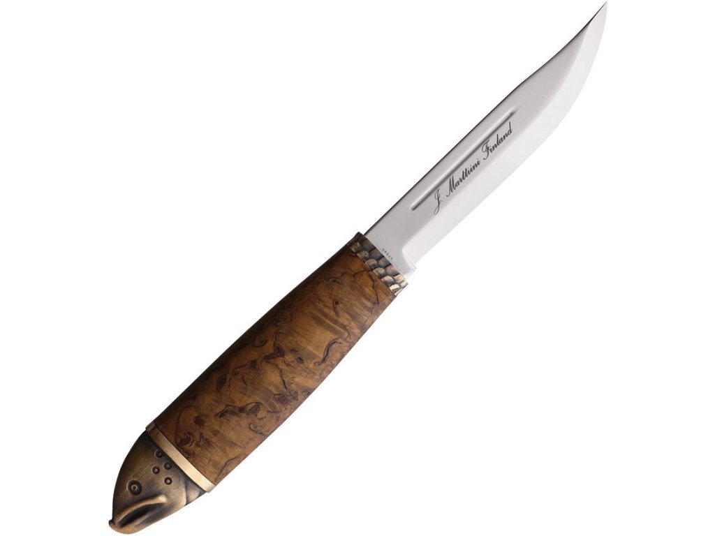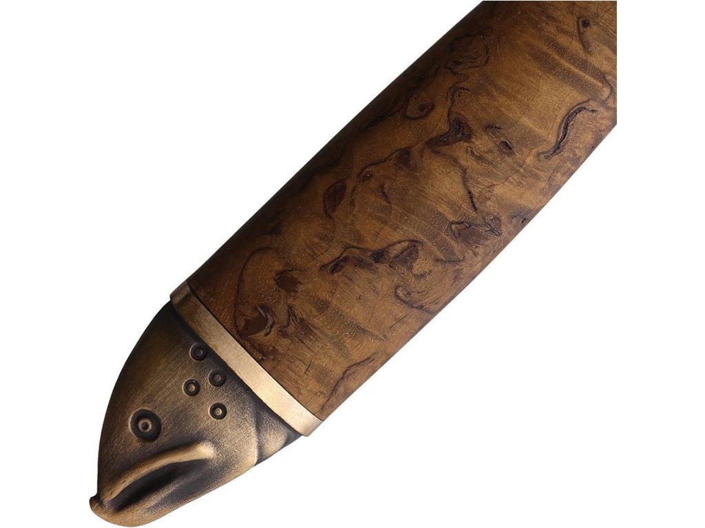Čepel je vyrobena z kvalitní nerezové oceli s lesklou úpravou. Rukojeť je vyrobena z tepelně upraveného dřeva kudrnaté břízy s přírpdní kresbou. Rukojeť je zakončena bronzovou plastikou hlavy lososa Součástí je černé kožené pouzdro se vzorem rybých šupin.