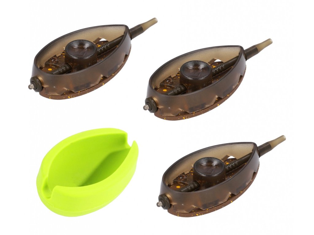 Evoluce krmítek method feeder Aperio. Q.M.F. Jde o rychlý a snadný způsob, jak vyměnit krmítko, aniž by bylo nutné odzbrojit celou sestavu. Stačí odstranit gumové pouzdro, vysunout krmítko z vřetena a nahradit jej jinou gramáží.