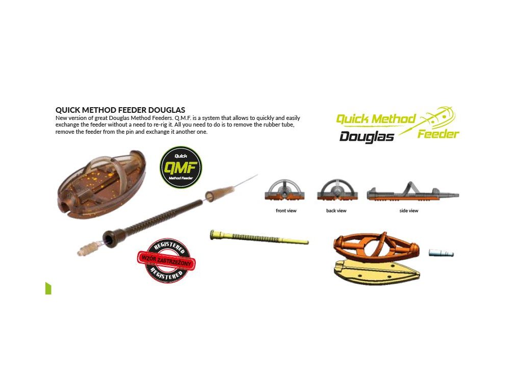 Nová verze skvělých krmítek Douglas Method Feeders. Q.M.F. je systém, který umožňuje rychle a snadno vyměnit krmítko, aniž by bylo nutné přezbrojovat celou udici. Vše, co musíte udělat, je odstranit gumovou převlečkui, vyjmout krmítko z trnu a vyměnit za jiné.
