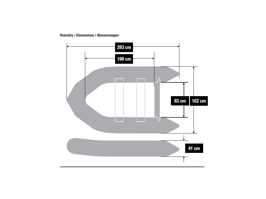 Nadstandardní šířka a specifický tvar člunu zajišťují extrémně velký vnitřní prostor. Ten je vždy výrazně větší než u běžných člunů stejné délky na trhu. Tomu napomáhá i specifické řešení zadní části plováků, které dovoluje umístit zrcadlo co nejblíže ke konci plováků a zároveň zachovat jejich funkci při udržování směru jízdy. Výrazně zdvihnutá příď spolu se speciálním tvarováním přední části, mohutným nafukovacím kýlem v celé délce podlahy a speciálně tvarovaným zrcadlem zajišťují vynikající hydrodynamické vlastnosti člunu a směrovou stabilitu. To v praxi znamená vyšší rychlost , snadnější ovládání a nižší spotřebu energie při pohonu člunu. Zesílený materiál plováků zvyšuje odolnost proti proražení. Nafukovací podlaha se zdvojenou nášlapnou vrstvou je téměř nezničitelná a její zelená barva skvěle ladí s se zbarvením člunu i černými vesly a ostatními doplňky. Každý člun je vybaven řadou upínacích pásků na suchý zip v přední části i na zrcadle. Najdeme zde i masivní upínací popruh na příslušenství ve střední části.