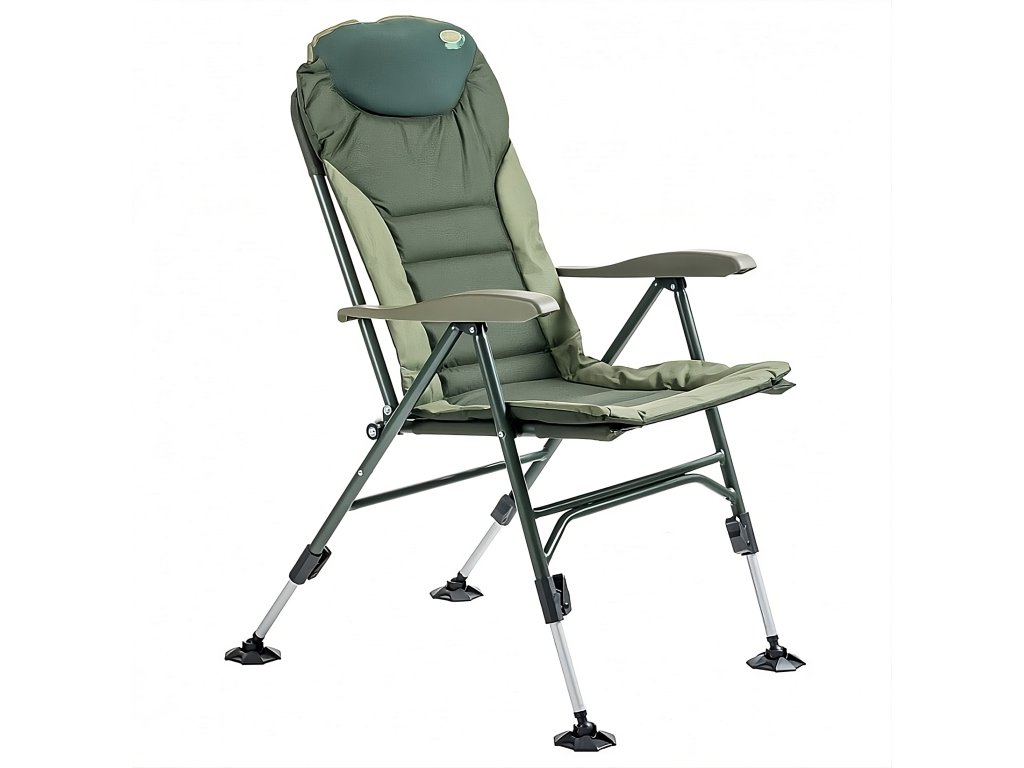 Kvalitní, klasické rybářské křeslo s nastavitelnými nohami a područkami.