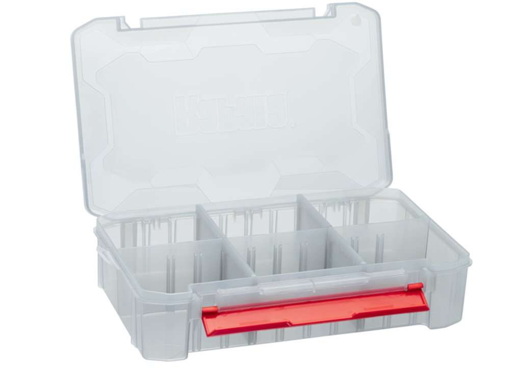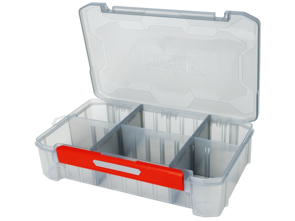 - Přizpůsobitelné uspořádání: Rigidní přepážky lze nastavit podle velikosti nástrah a doplňků.