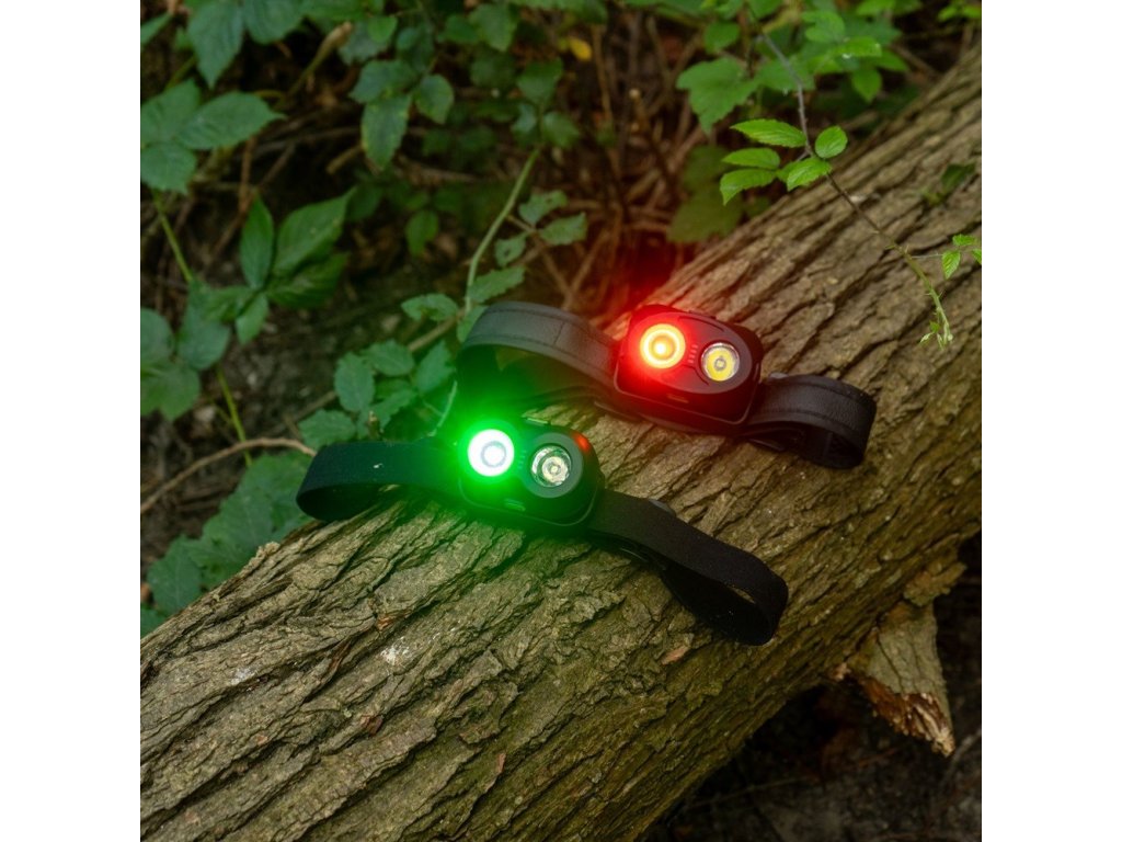 Velmi silná čelovka s diodou CREE, doplněna diodami v barvách červené a zelené, ideální pro noční lov.