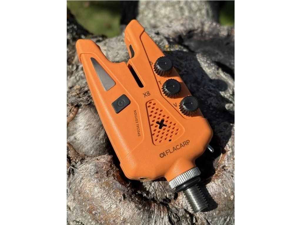České signalizátory záběru FLACARP X8 vycházejí z oblíbeného modelu X7 a přidávají množství užitečných funkcí. Kromě osvědčeného designu, velmi vysoké mechanické odolnosti, precizního snímače odvíjení vlasce s potahem již od 1,5mm v obou směrech a v neposlední řadě napájení běžnými tužkovými články AAA, byly přidány nové funkce: režim potlačení falešných poplachů (např. při rybolovu v nepříznivém počasí nebo ze člunu), noční poziční světlo na swingeru, širší rozsah regulace délky potahu vlasce od 1,5mm až do 30cm, vylepšený zvuk padáku pro jednoznačné rozlišení směru odvíjení vlasce, širší rozsah nastavení barev LED a další vylepšení.