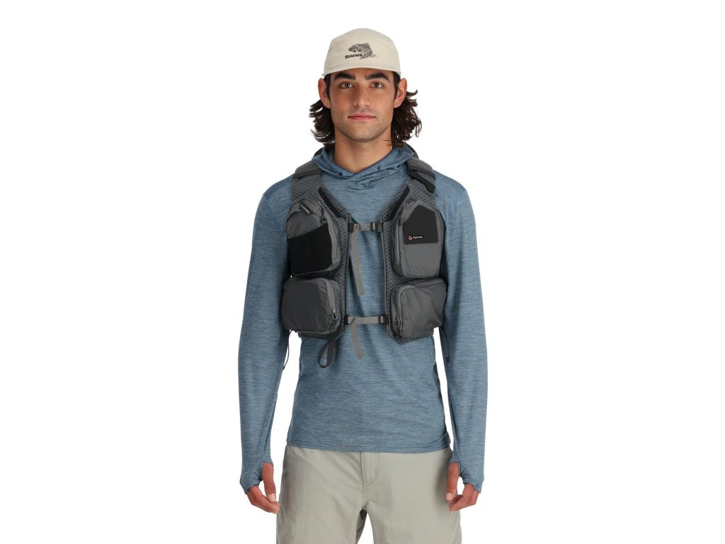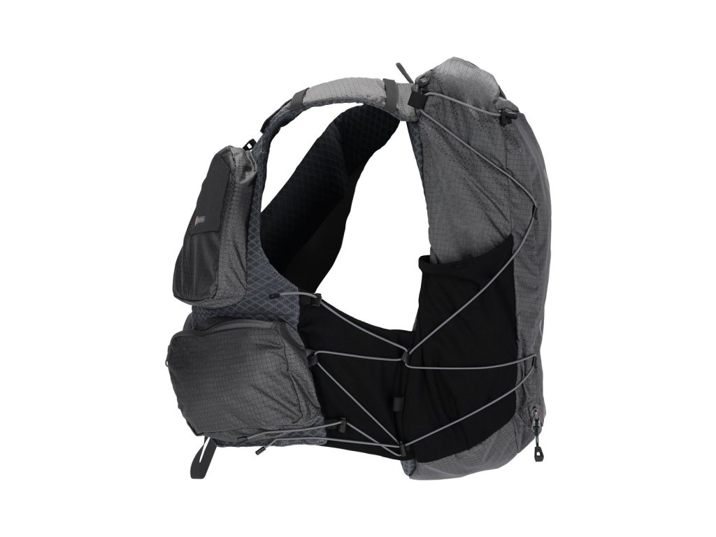 Simms Flyweight Vest Pack v barvě Smoke je lehká a odolná rybářská vesta kombinovaná s batohem, navržená pro rybáře, kteří vyžadují funkčnost a dostatek úložného prostoru při zachování maximální prodyšnosti.