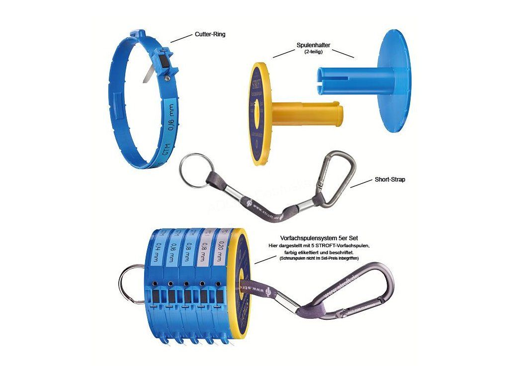 Sada obsahuje: Držák cívek s karabinkou Stroft Short-Strap 1 ks, Zásobník na 5 cívek vlasce Stroft 1 ks, Odvíječe vlasce Cutter-Ringy 5 ks + 25 ks etiket.