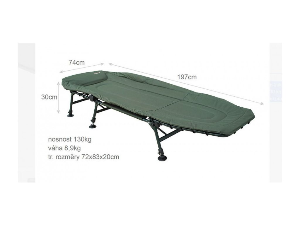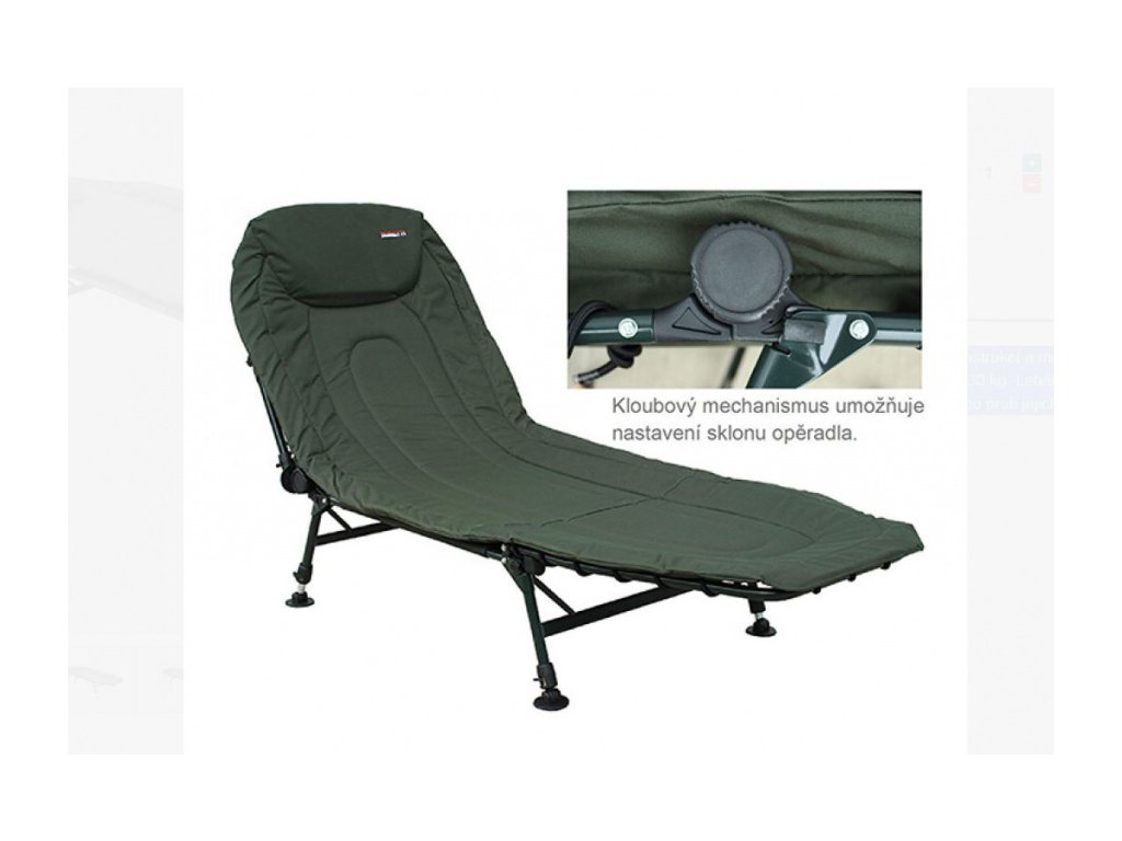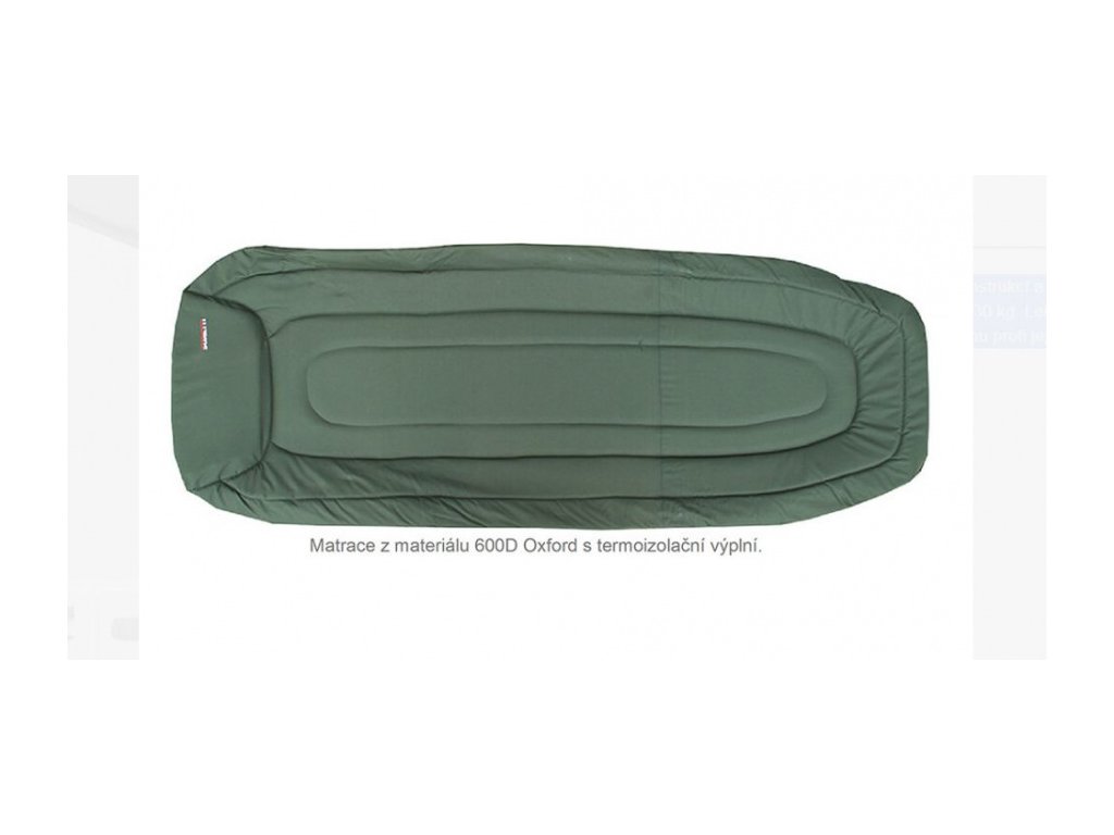 Lehátko Fishmaster s třemi páry nohou, ocelovou konstrukcí a matrací z 600D Oxford-Nylonu s termoizolační vrstvou.