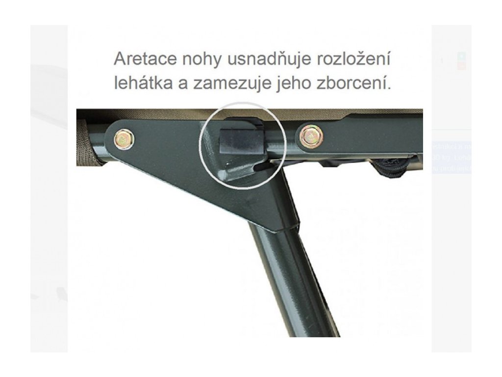 Lehátko má klouby sklonu zad, packy nohou s protiskluzovým dezénem, aretaci nohou proti jejich sklopení a jednoduchý stavitelný zámek.