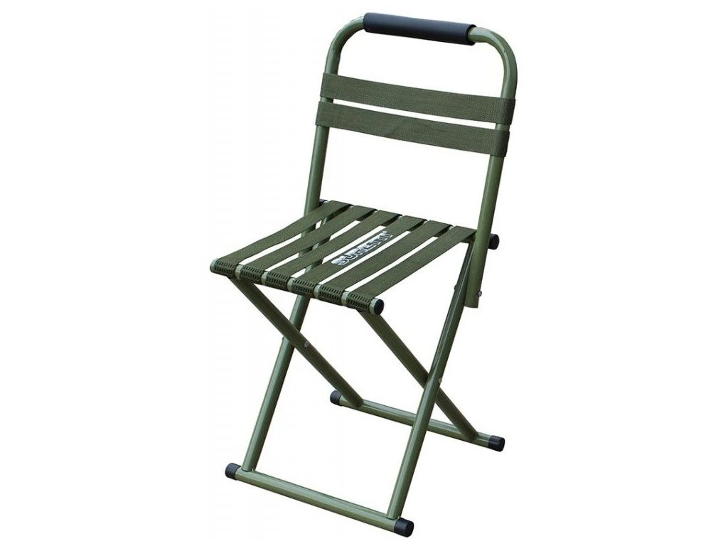 Praktická, malá, skládací rybářská stolička s opěradlem.
