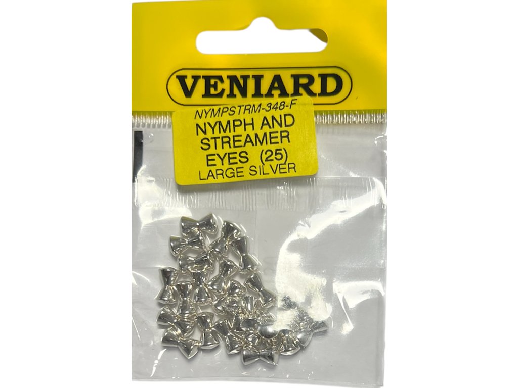 Veniard Nymph & Streamer Eyes jsou kvalitní kovové oči ve tvaru činky, které dodají vašim muškám realistický vzhled a zároveň pomohou s jejich správným vedením ve vodě. Jsou ideální pro široké spektrum vzorů od menších nymf až po větší streamery.