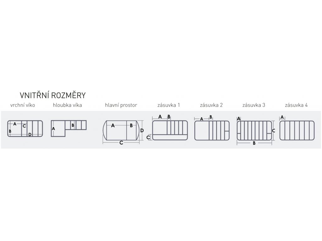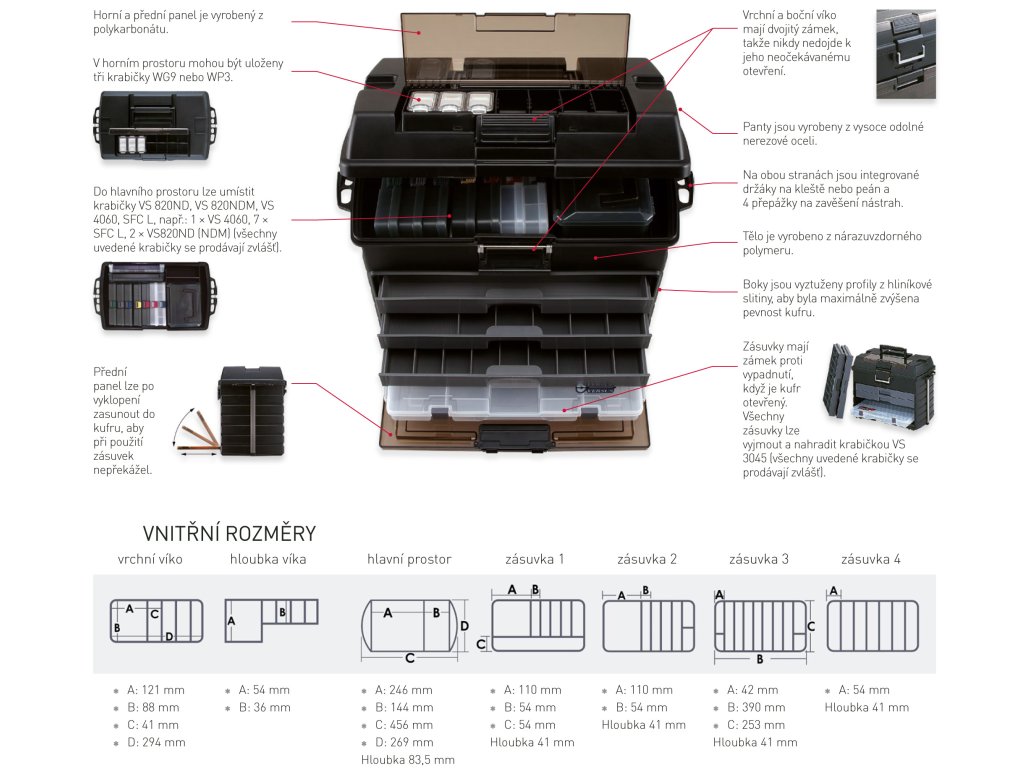 Pevnost je zajištěna jak hliníkovým vyztužením na bocích, tak i horním poklopem z nerezové oceli. Pohodlnou manipulaci zajistí držáky umístěné na spodní drážce, která je umístěna po obou stranách horního panelu a do níž tento panel zapadá. Jistě oceníte množství úložného prostoru členěného do četných šuplíků. Místo nich lze dokoupit krabička VS-3045. Pod poklop pasují krabičky typu VS-820ND, VS-820NDM a V-4060.