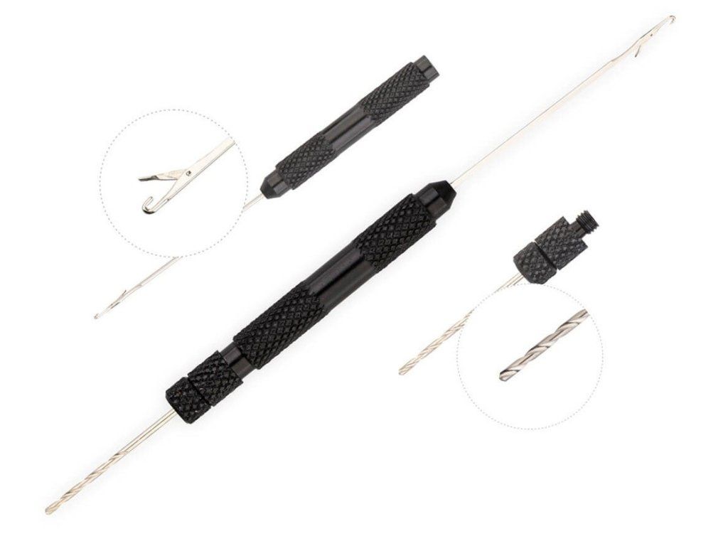 Sada obsahuje jehlu s háčkem pro provlečení vlasového přívěsu skrz nástrahu a malý vrtáček pro předvrtání tvrdších nástrah. Díky tomu lze nástrahu připravit rychle, přesně a bez jejího poškození.